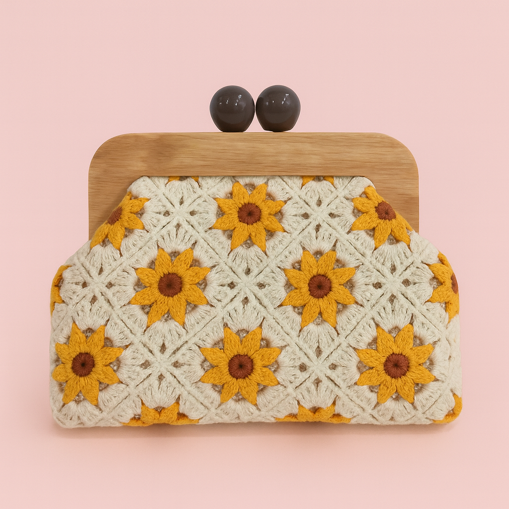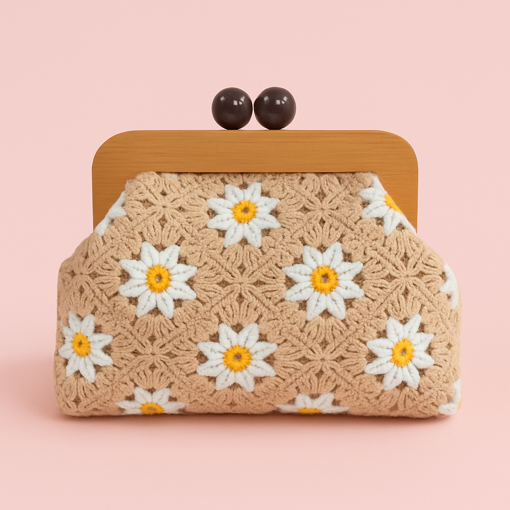 Elevate your everyday style with the Wood Clutch Daisy — a beautifully handcrafted crochet bag designed to bring charm and elegance to any outfit.