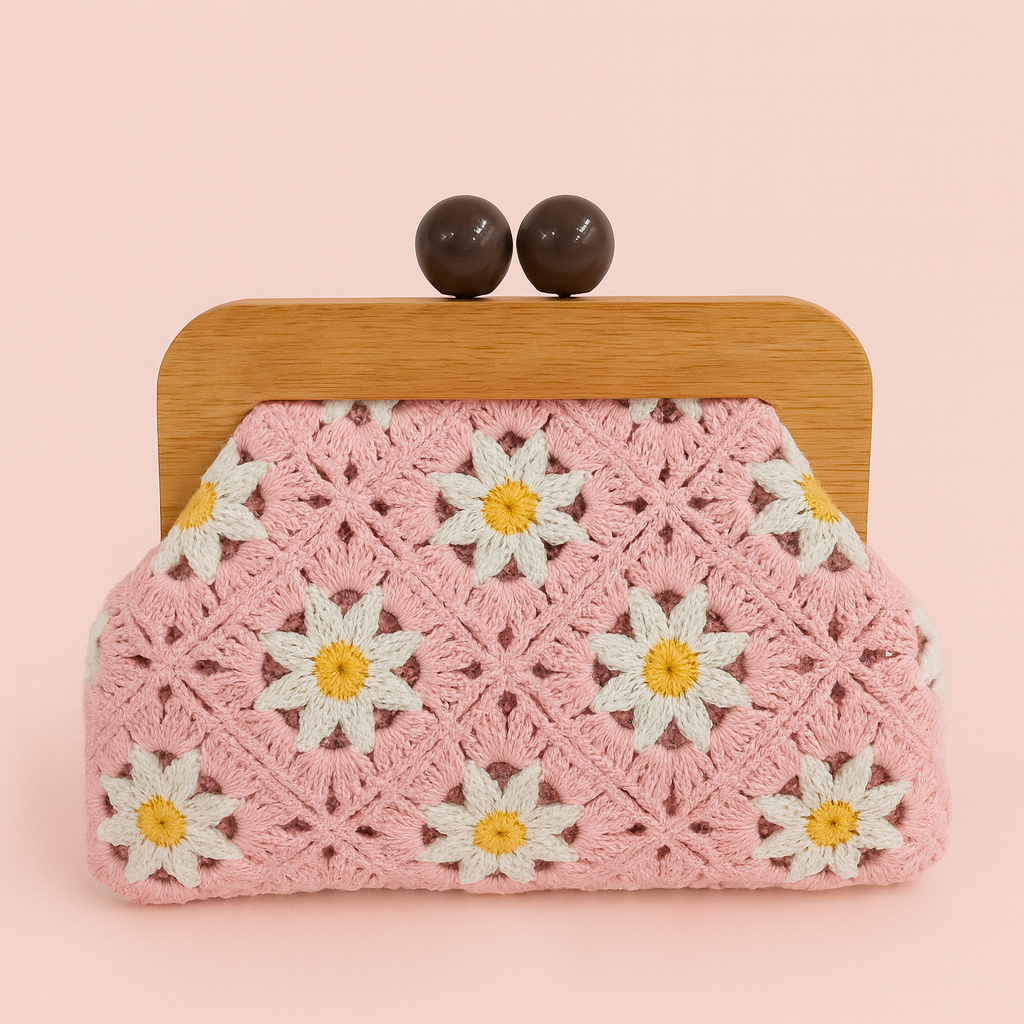 Featuring delicate daisy-patterned crochet work and a premium wooden frame, this clutch blends artisanal detail with modern design.