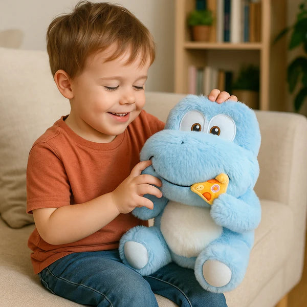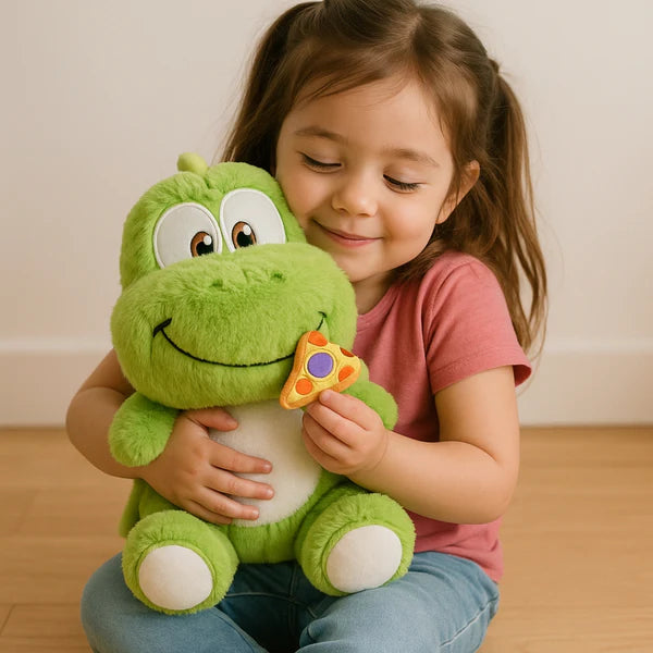 Introducing the Dino Lovasaur, the cutest dino you'll ever meet! This soft and cuddly toy is baby pink with touches of white, and a smiling face that's always ready for a pizza party. Watch as the pizza disappears when you pull it away - a fun surprise for all!