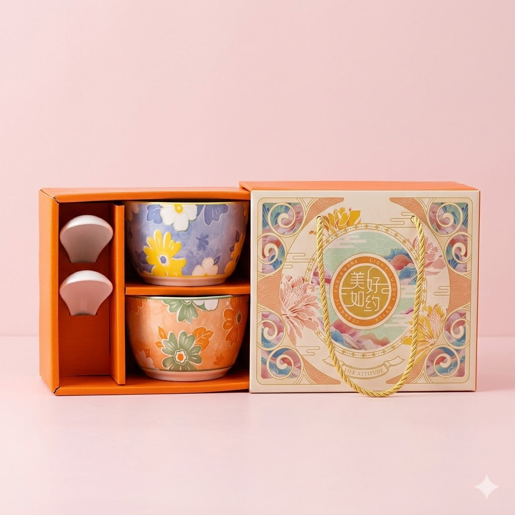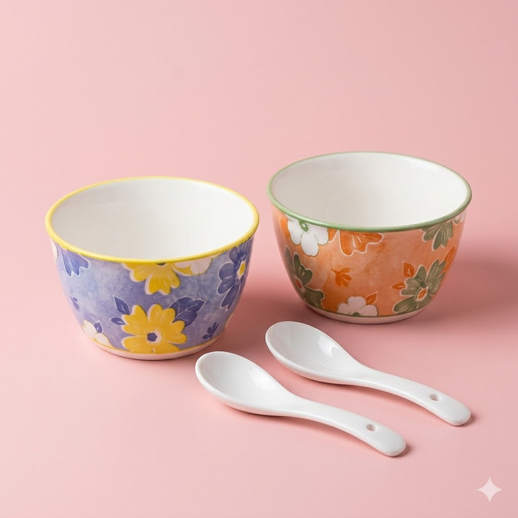 Elevate your dining experience with this charming ceramic bowl set. Each piece features an elegant flower design that brings natural beauty to your table. This set includes two ceramic bowls and two matching spoons, perfect for serving soups, desserts, or everyday meals. Crafted with quality ceramics, these bowls combine functionality with aesthetic appeal, making them ideal for both casual dining and special occasions. A versatile addition to any kitchen.