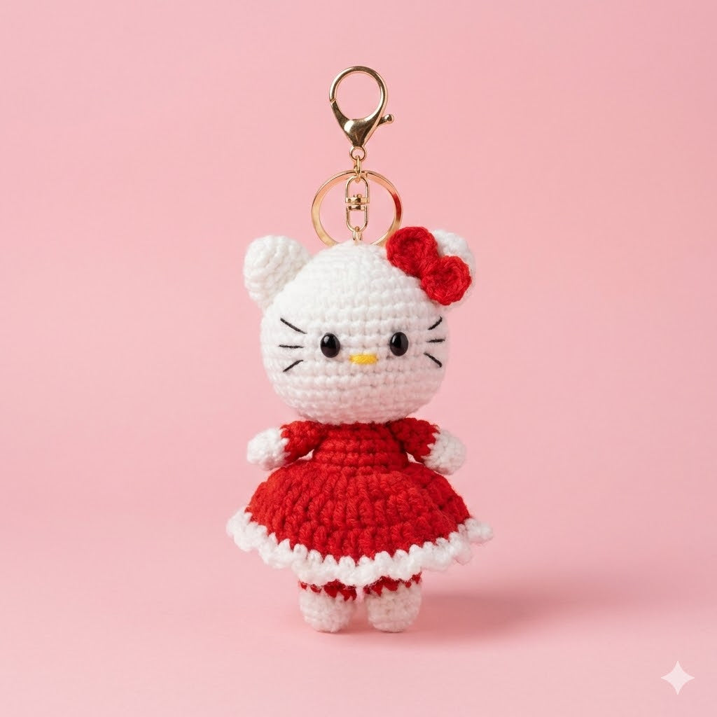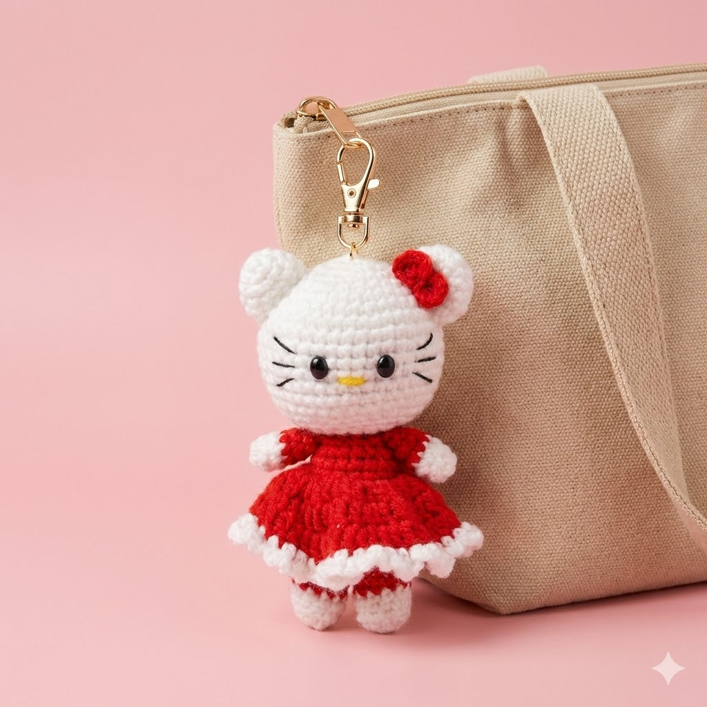 Add a touch of nostalgia to your everyday carry with this adorable crocheted Hello Kitty bag charm. Handcrafted with care, this cute accessory features the iconic character in soft, textured yarn that brings personality to backpacks, purses, and tote bags. Perfect for fans of the beloved character, it's a delightful way to express your style while keeping your essentials organized and easy to spot.
