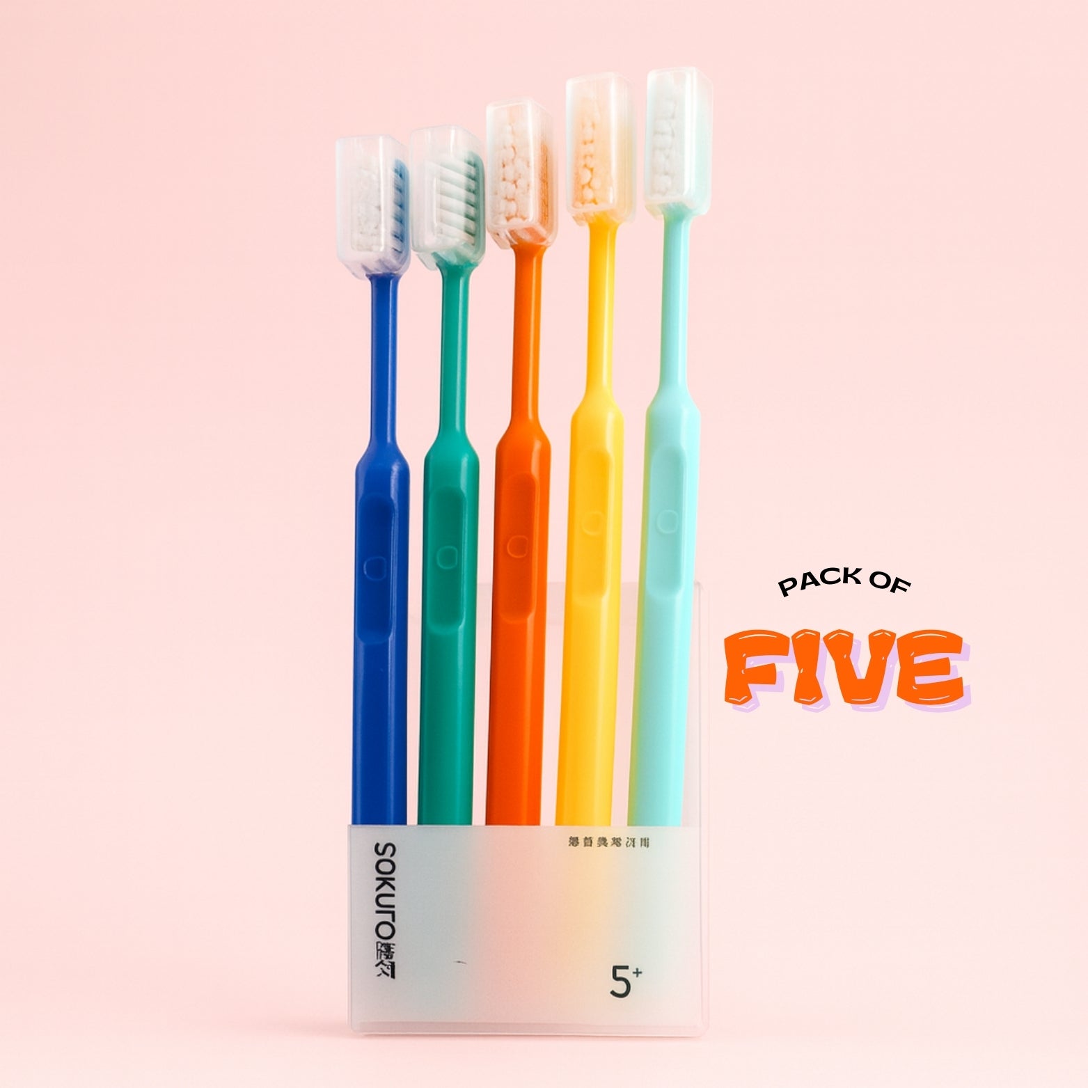 Upgrade your daily routine with this Vibrant 5 Toothbrush Set (Pack of five) featuring five ultra-soft, high-density bristle brushes designed for gentle yet effective cleaning. Each toothbrush comes in a modern pastel handle that adds a refreshing pop of color to your bathroom. The compact brush head reaches deep between teeth, ensuring a thorough clean with reduced pressure on gums. Made for everyday comfort, the ergonomic grip offers secure handling for all ages. A sleek, hygienic travel-friendly case completes the set, making it ideal for home, office, or gifting.